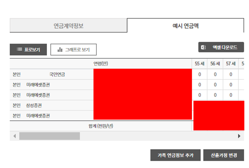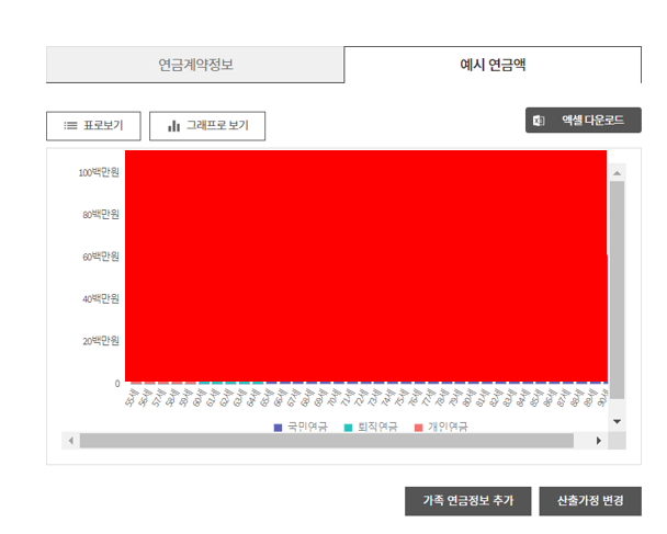 - 표/그래프 형식으로 예상되는 연금수령액을 확인 할 수 있습니다.