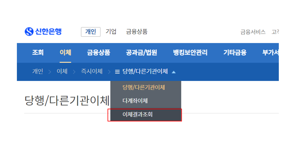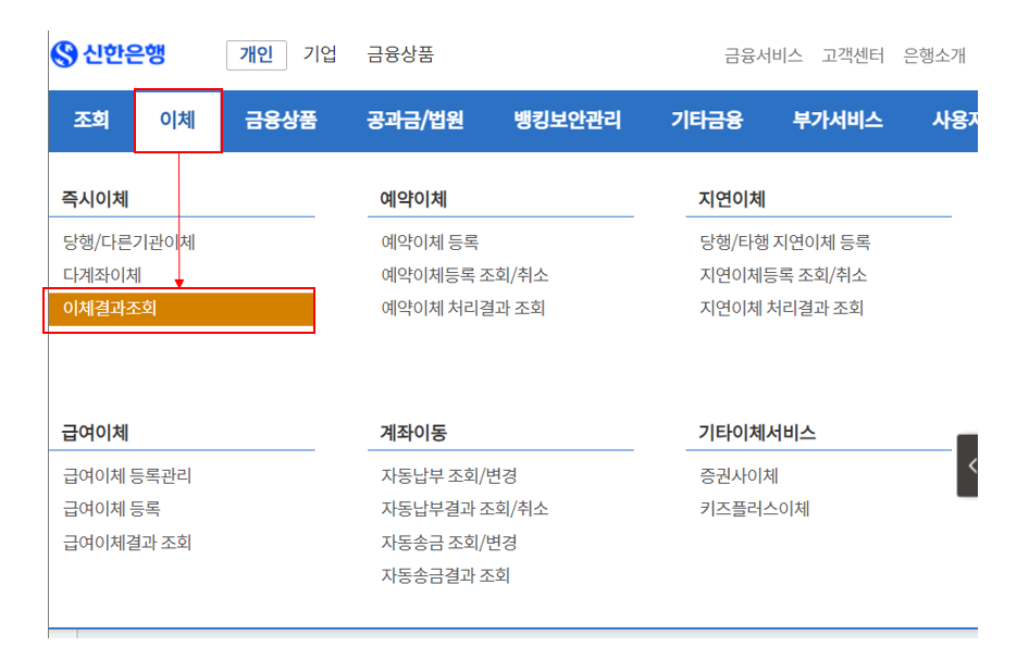 2) 메인 화면에서 개인을 클릭 한 경우: 이체를 클릭 후 즉시이체에서 아래 표시된 이체결과 조회를 클릭합니다.