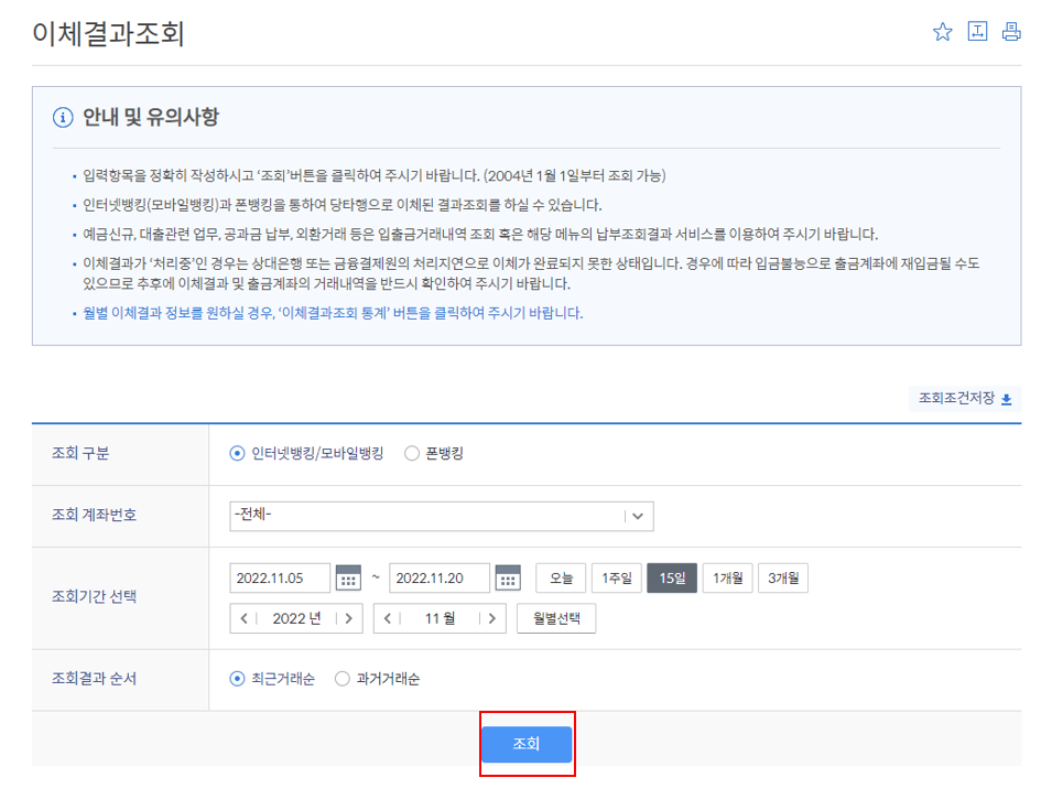 2. 이체결과 조회 클릭 방법 2 두가지