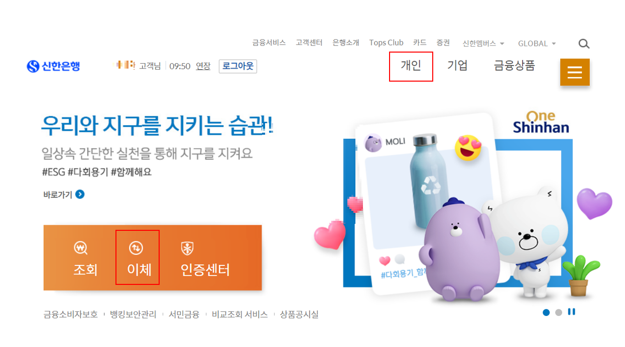 1) 아래와 같이 개인 또는 이체를 클릭합니다.