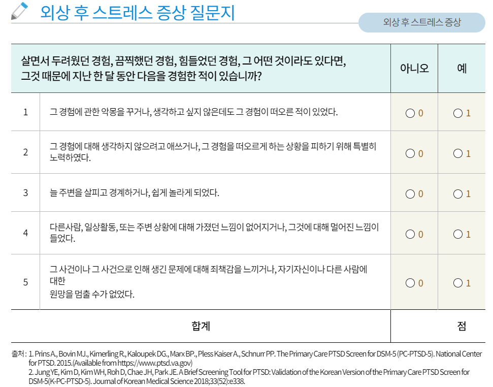 외상 후 스트레스 증상 자가진단에 사용되는 척도의 저작권은 국립정신건강센터에 한하여, 사용승인된 것으로 귀 기관에서는 저작권자의 허락없이 배포를 금함. 자가진단 척도 사용 및 배포가
