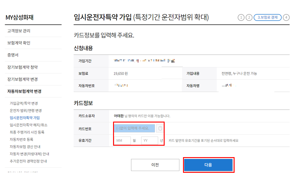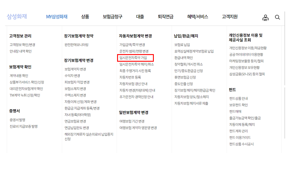 - My 삼성화재에서 임시운전자 특약 가입 클릭