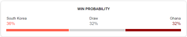 - 승리 예측: 한국 승: 36%, 무승부 32%. 가나 승: 32%