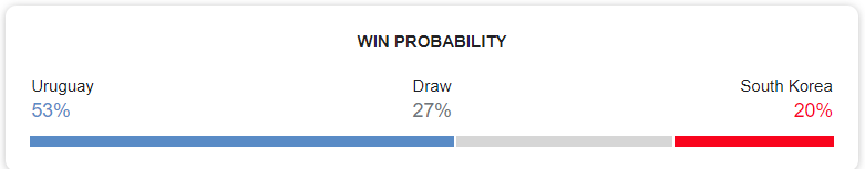 - 승리 예측: 한국 승: 20%, 무승부 27%. 우루과이 승: 53%