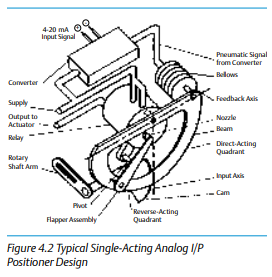 일반적인 아날로그 I/P 포지셔너(그림 4.2 참조)에서 컨버터는 DC 입력 신호를 수신하고 노즐/플래퍼 배치를 통해 비례 공압 출력 신호를 제공합니다. 공압 출력 신호는 공압 포지셔너에 입력 신호를 제공합니다. 그렇지 않으면 설계는 공압 포지셔너와 동일합니다.