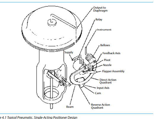 1) 공압 Positioners 첫 번째 범주는 공압 Positioner입니다. 레거시 처리 장치는 제어 밸브들에 대한 제어 설정 점으로 공압 신호를 사용할 수 있다. 압력은 일반적으로 20.7~103kPa(3~15psig)로 조절되어 밸브를 0~100% 위치로 이동합니다. 공통 공압식 포지셔너 밸브 스템 또는 샤프트는 공압식 제어 신호를 수신하는 벨로우즈의 위치와 비교됩니다. 입력 신호가 증가하면 벨로우즈가 팽창하여 빔을 이동합니다. 빔은 입력 축을 중심으로 회전하며, 입력 축은 플래퍼를 노즐에 더 가까이 이동합니다. 노즐 압력이 증가하면 공압 증폭기 릴레이를 통해 액추에이터로 가는 출력 압력이 증가합니다. 액추에이터에 대한 출력 압력이 증가하면 밸브 스템이 움직입니다. 스템 이동은 캠을 통해 빔으로 피드백됩니다. 캠이 회전할 때 빔이 피드백 축을 중심으로 회전하여 플래퍼를 노즐에서 약간 멀리 이동합니다. 노즐 압력이 감소하여 액추에이터로 가는 출력 압력이 감소합니다. 스템 운동은 평형에 도달할 때까지 플래퍼를 노즐에서 멀리 밀어내며 계속됩니다. 입력 신호가 감소하면 벨로우즈가 수축되고(내부 범위 스프링에 의해 지원됨) 빔이 입력 축을 중심으로 회전하여 플래퍼를 노즐에서 멀리 이동합니다. 노즐 압력이 감소하고 릴레이가 다이어프램 케이스 압력을 대기로 방출하여 액추에이터 스템이 위로 이동할 수 있습니다. 캠을 통해 빔으로 스템 이동이 피드백되어 플래퍼가 노즐에 더 가깝게 재배치됩니다. 평형 상태가 되면 스템 이동이 중지되고 액추에이터 압력이 더 이상 저하되지 않도록 플래퍼가 배치됩니다. 그림 4.1을 참조하십시오.