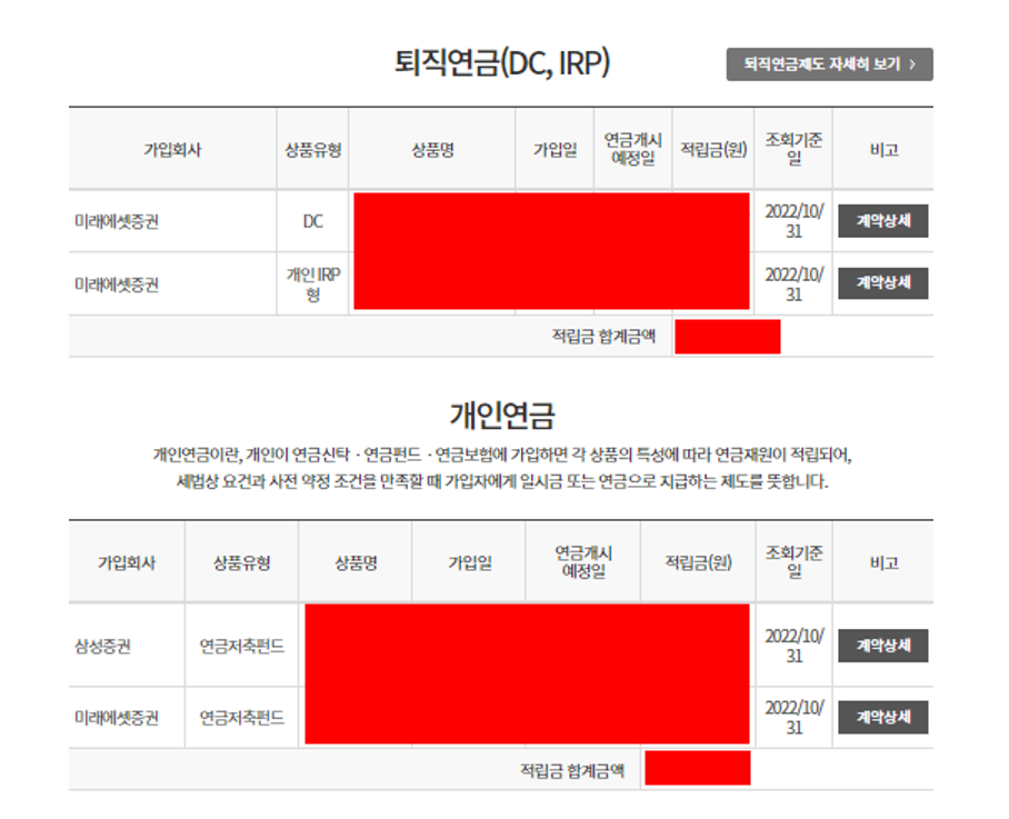 - 본인이 가입한 연금에 따라 아래와 같이 조회됩니다.